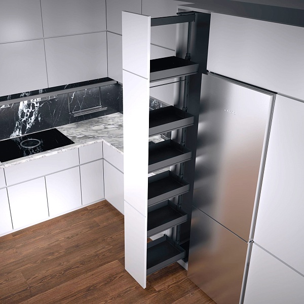 • Высокая нагрузка на механизм в 100 кг (по 18 кг на полку) позволяет организовать хранение большому количеству предметов, при этом даже при полной загрузке система выдвигается легко.